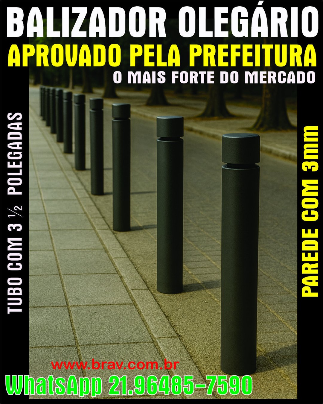 Perfeito contra estacionamento irregular de veículos sobre a calçada. Nossos balizadores são fabricados de acordo com as normas da Prefeitura da Cidade do Rio de Janeiro com diâmetro mínimo de 3 ½ polegadas, não pode ser diâmetro menor, sem risco de multa ou remoção.
